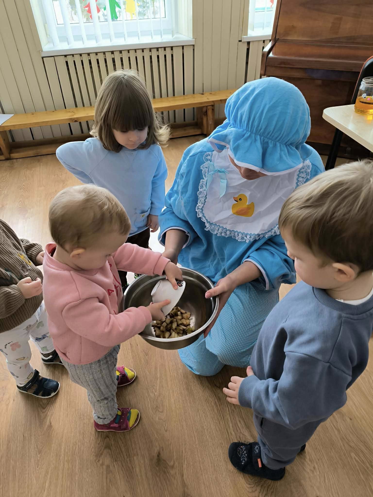 Po tyrinėjimo aktyviai pajudėjome mankštelės metu, o veiklos pabaigoje gaminome spalvingas vaisių salotas.